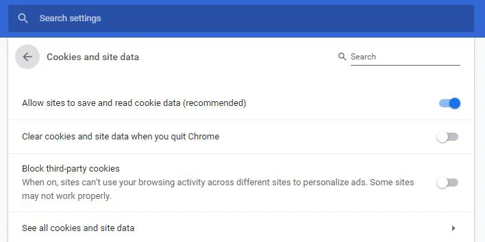 - Under Cookies and data stored section select Manage and delete cookies and site data. Make sure the Block third-party cookies is grey – not blue.